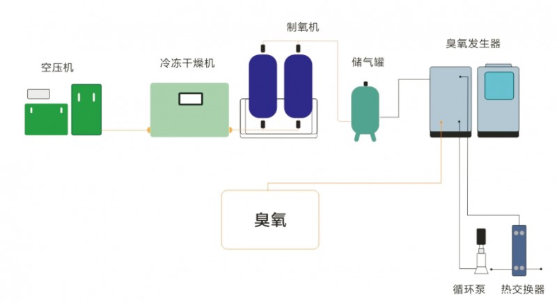 富氧源臭氧系統(tǒng)主要包括:空氣壓縮機、兩級除油、除水過濾器、氣體顆粒過濾器;冷干機、制氧機、儲氣罐、臭氧發(fā)生器主機;控制閥門和檢測儀表;臭氧和尾氣破壞系統(tǒng)組成。